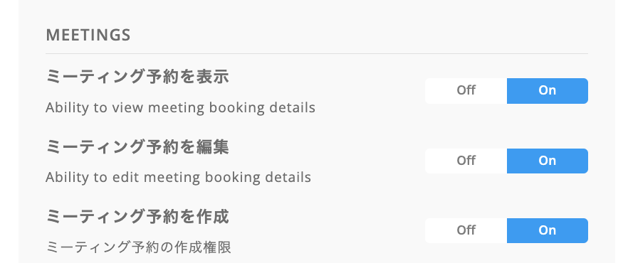 3.MEETINGSの下記3項目をOffからOnにし、左下の「保存」ボタンを押す