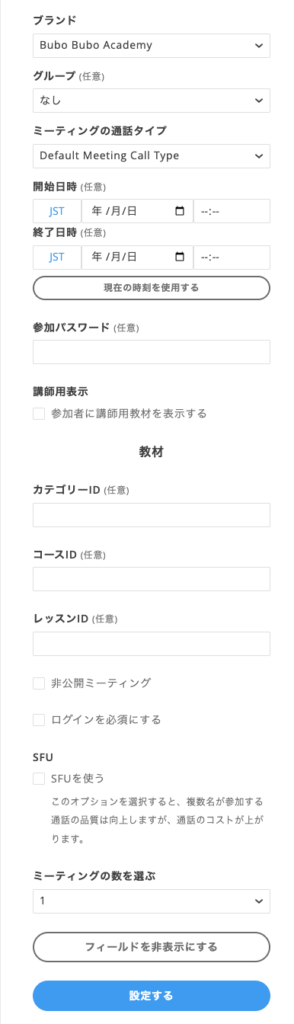 ミーティングの数を選ぶ...上の設定で発行する通話URLの数を選択します。プルダウンで10種類の数量が選べます。