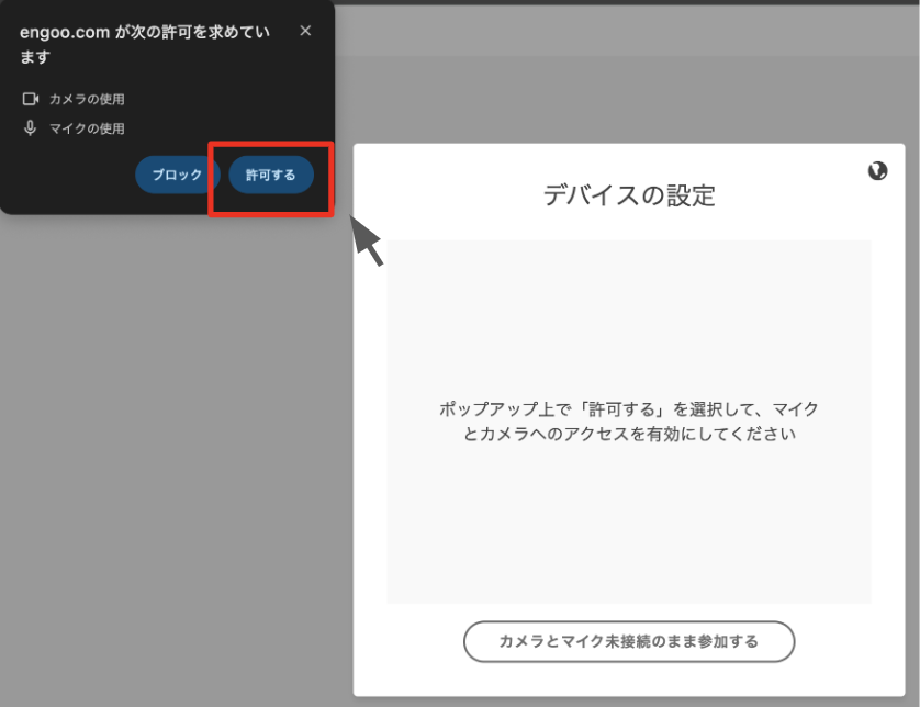 カメラとマイクを許可すると「デバイスの設定」画面に移行します。