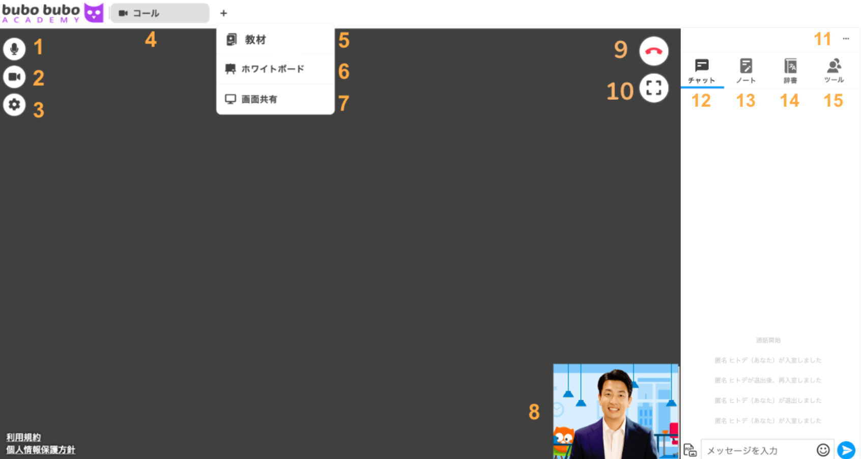 | 5.教材 | ビデオ通話画面に格納されている教材を選択して開きます。 |