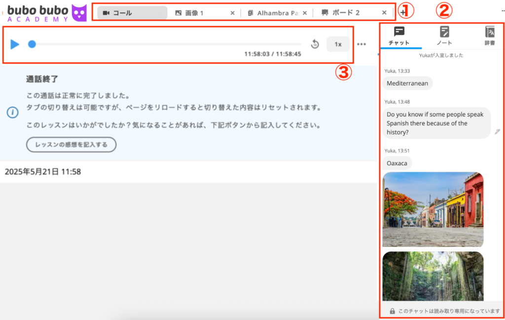 | ①タブ | 通話時に使用した教材、画像ファイル、ホワイトボード |