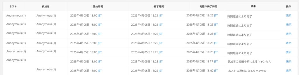 | 遅刻判定 | 通話開始時間から○秒以内に入室がない時 |