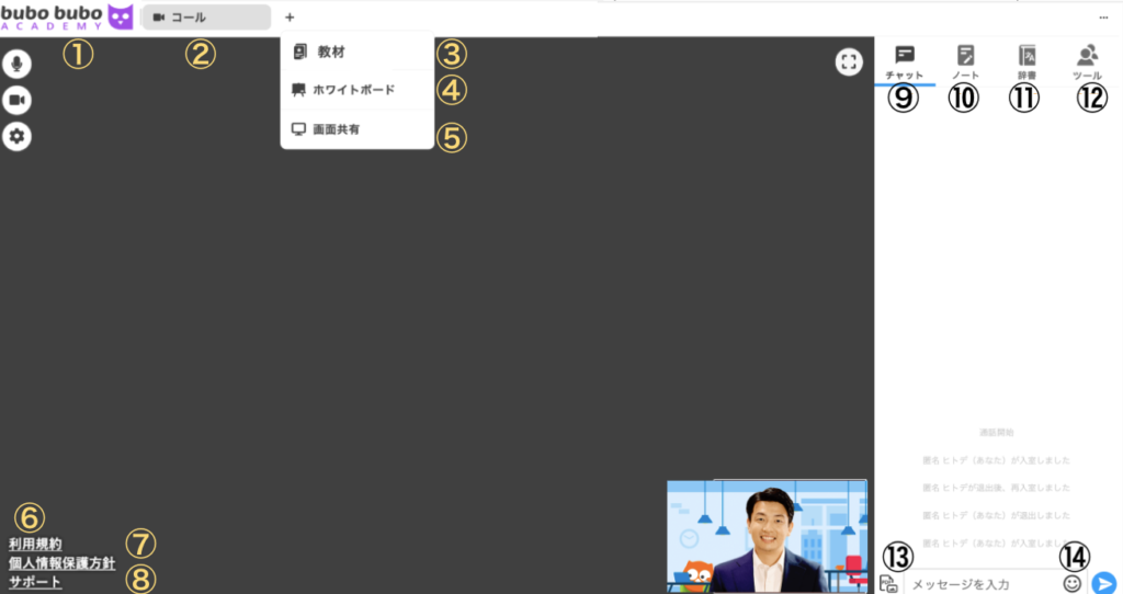 | ⑪辞書 | 表示のON/OFF | 分からない英単語をビデオ通話上で調べる |