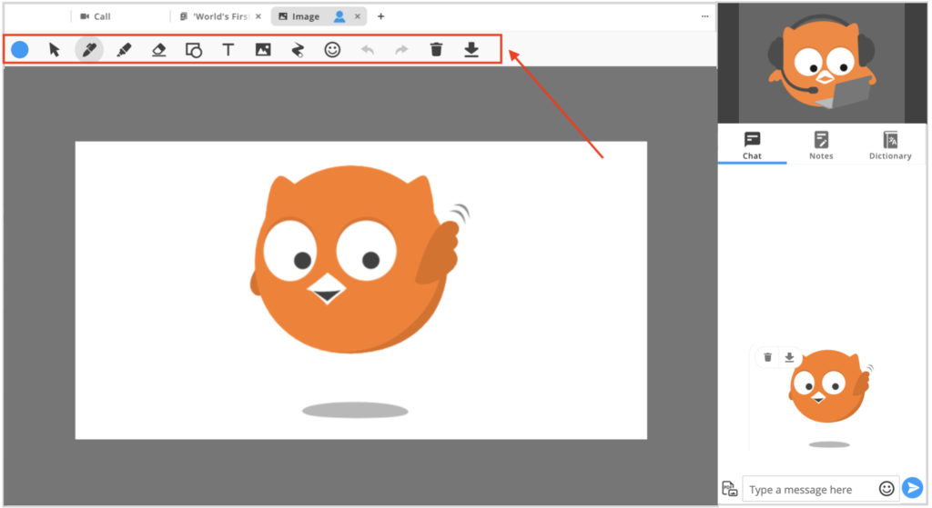 ビデオ通話システムでは一般的な描画ツールですが、Bellbirdでは描画ツールを使える場面がより多く、また外国語を学ぶ際のコミュニケーションを助ける付加機能も搭載されています。
