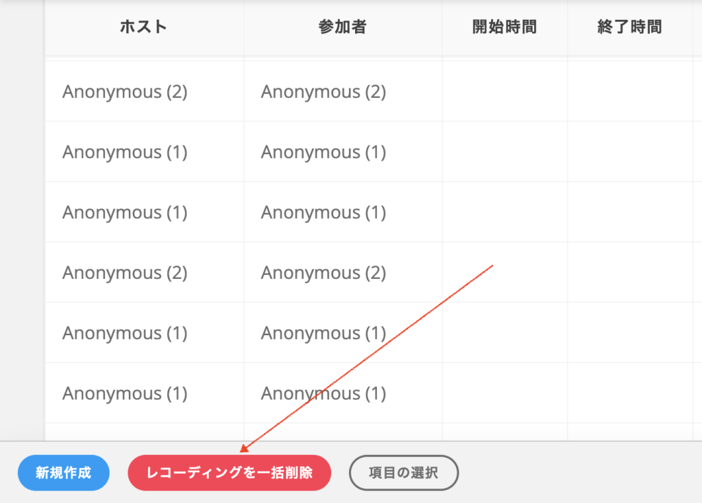 3.期間指定してソートされた状況で、左下にある「レコーディングを一括削除」ボタンをクリック