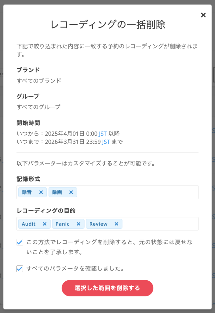 使用することのないレコーディングを一気に削除したい企業様におすすめの機能です。