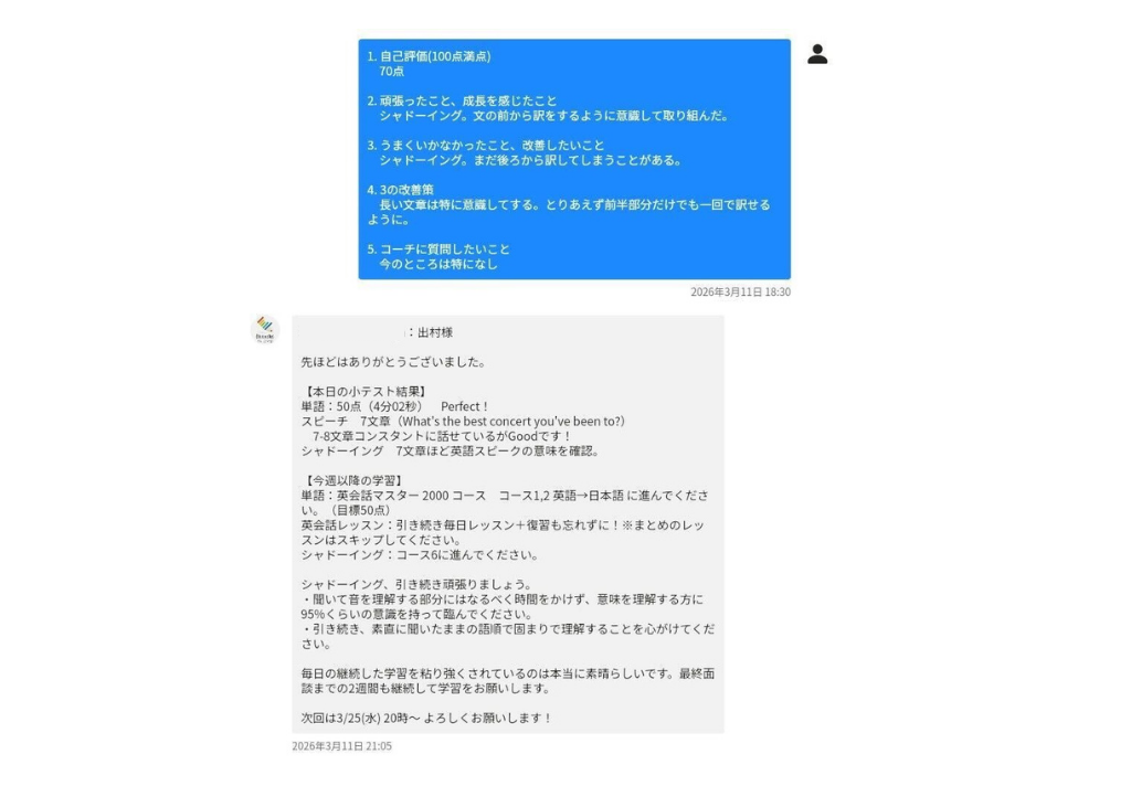 最初は10〜15点くらいだったのが、1ヶ月目で40〜50点になり、今は「65〜70点」くらいまでは来たかなと思います。 課題の解像度が上がった分、「これができない理由なんだな」というのが明確に見えてきているので、それを解決するために次どうしようか、と少し停滞感(壁)を感じる部分もありますが、マイナスな感情ではなく「次はこうやって喋ろう」という復習のモチベーションになっています。