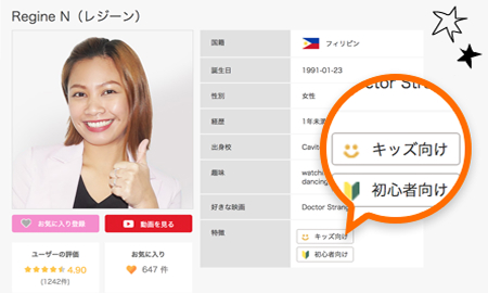 お子様のレッスンに慣れた「キッズ対応講師」を検索して選ぶことができます。さらに、今回の学生プラン限定特典(チケット)を使えば「日本人講師」のレッスンも予約可能。「いきなり外国人は不安」というお子様も、日本語で優しくサポートを受けられるので安心です。